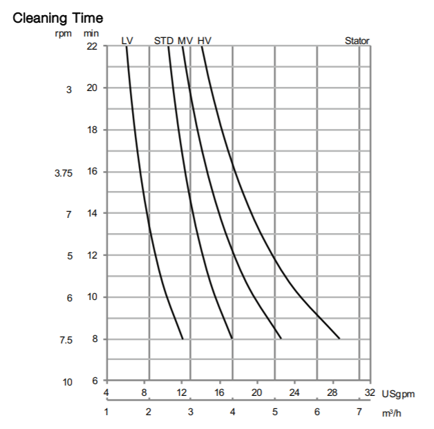 A choice of nozzle sizes and stators offers a range of flow rates, pressures and wash cycle times.