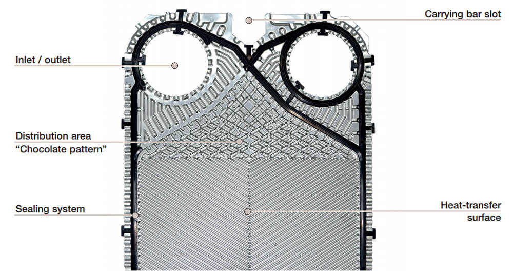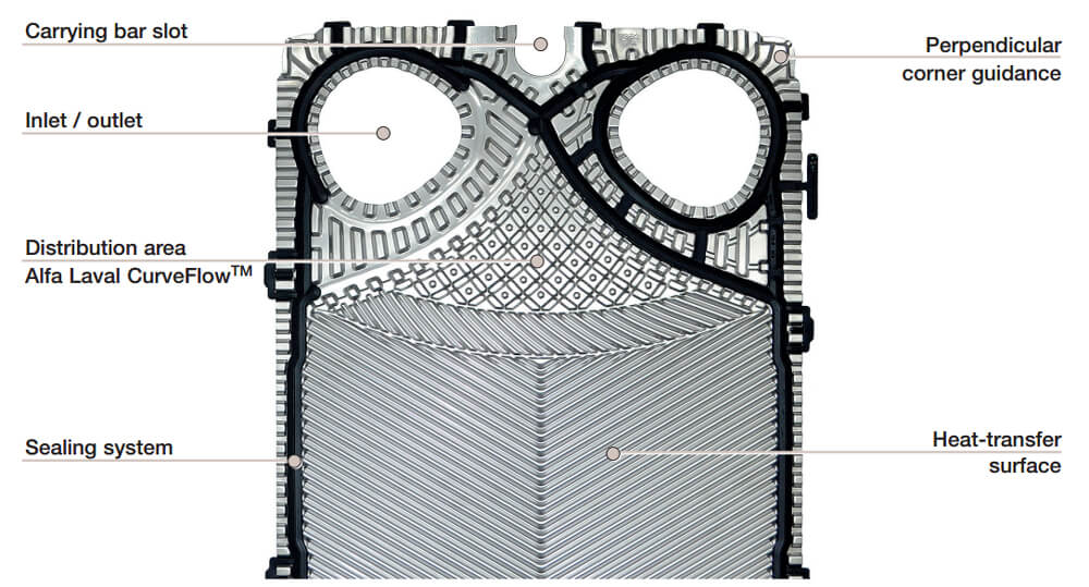 De distributiezone van de plaat wordt volgens een chocoladepatroon geperst (ontworpen door Alfa Laval). Deze speciale distributiezone geeft een aantal voordelen: